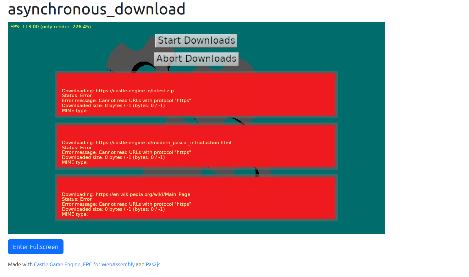EDownloadError: Cannot read URLs with protocol "https", and then the exception crashes the application (as WASI cannot catch exceptions). But this is a different problem, it will be solved by just implementingTCastleDownloadon the web soon using JSXMLHttpRequest. )So, I think actually all is good now, with new