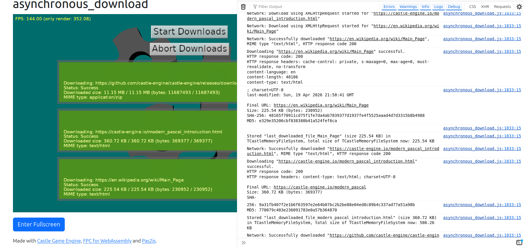 - examples/network/asynchronous_download/ – simply download real data from various real servers. Downloads asynchronously (without blocking the UI, animations etc.) I added to this example showing (in log) MD5 and SHA-256 checksums of the downloaded contents, so we can easily confirm that indeed it downloads 100% correct data.
